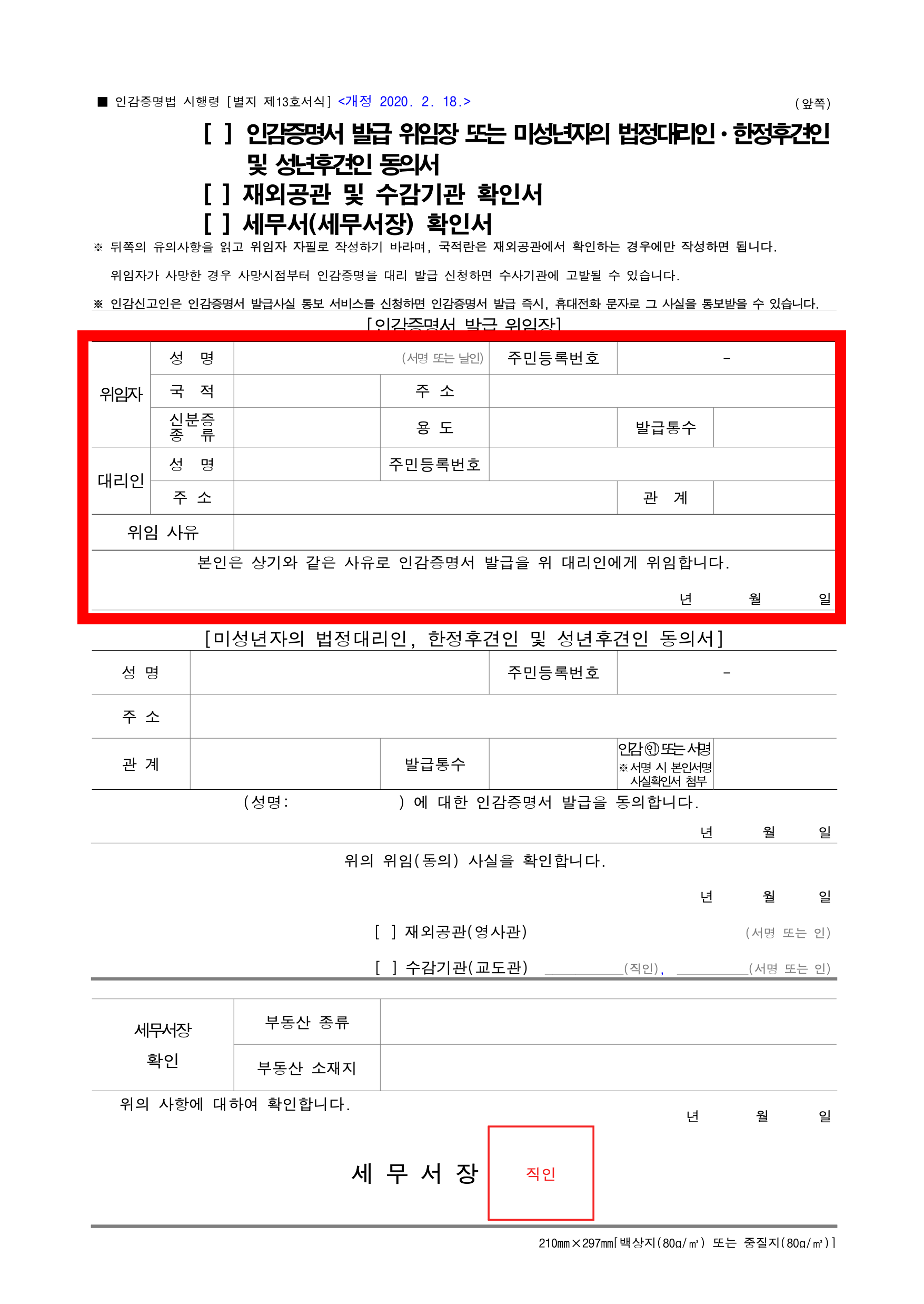 해당 서류양식은 인감증명법시행령의 서식이나 재외공관 웹사이트에서 다운받을 수 있습니다. 그런데 재외공관 웹사이트의 서식이 최신이 아닌 경우가 있었어서 시행령에 있는 최신서식을 확인하길 권장합니다.